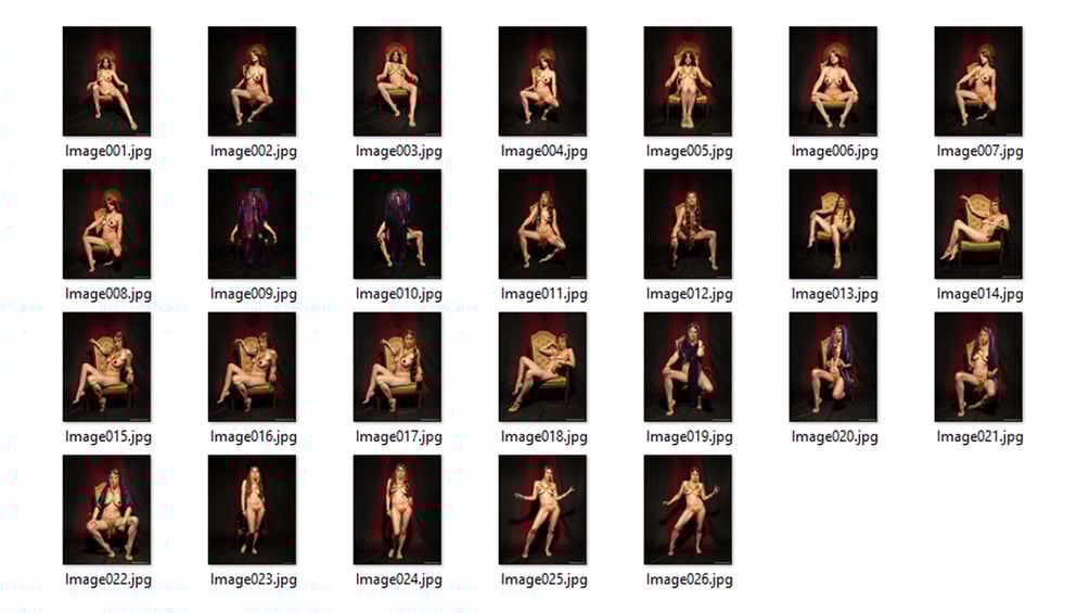 These images contain censorship! 26 high res photos of a woman adorned with gold jewelry, veil, and bikini-like metallic clothing. 22 sitting poses and 4 standing poses.